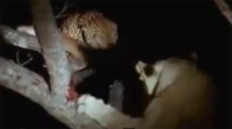 Điều không ngờ với báo đốm là sư tử cũng có thể leo cây. Và trước sức tiến công của 3 con sư tử, báo đốm bị trọng thương.
